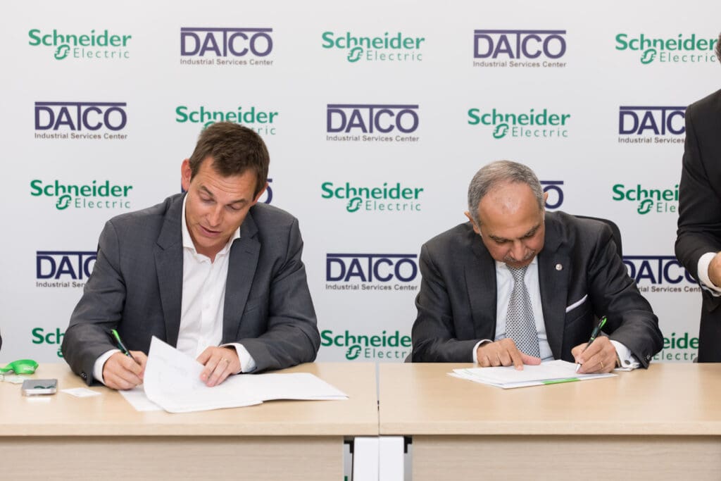 حضر مراسم التوقيع على الاتفاقية الجديدة من شنايدر إلكتريك كل من سباستيان رييز- الرئيس الإقليمى لشركة شنايدر إلكتريك لمنطقة شمال شرق إفريقيا والمشرق العربي والمهندس أحمد مدكور- نائب رئيس شنايدر إلكتريك مصر وشمال شرق أفريقيا والمشرق العربي لقطاع الصناعات، والمهندس محمد الحفناوي – نائب رئيس شنايدر إلكتريك مصر و شمال شرق إفريقيا والمشرق العربي لتطوير الاعمال، ومن داتكو المهندس/عادل محفوظ رئيس مجلس إدارة مركز الخدمات الصناعية، والمهندسة نورا حسن ، مدير قطاع تطوير الأعمال في المركز، ومحمد سعيد محروس – مدير خدمة العملاء.