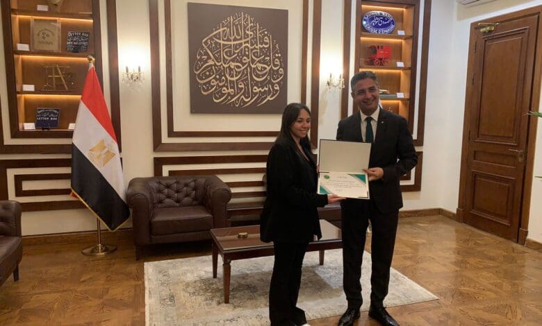 وسلم الدكتور شريف فاروق رئيس هيئة البريد المصري، الطالبة زينة عصام جائزة المركز الأول وشهادة تقدير لتصميم طابع لمكافحة الجريمة المنظمة للإتجار بالبشر أحد أهداف الأمم المتحدة، وجاء ذلك بحضور اللجنة القومية للطوابع التابعة للهيئة، وتتويجاً وتقديراً للقدرات التي أظهرتها الطالبة في التعبير الفني من خلال الطابع الفائز في المسابقة للحد من تداعيات هذه الجريمة.