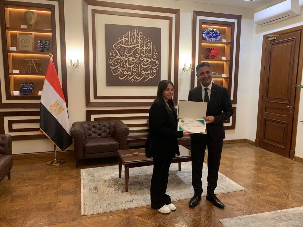 وسلم الدكتور شريف فاروق رئيس هيئة البريد المصري، الطالبة زينة عصام جائزة المركز الأول وشهادة تقدير لتصميم طابع لمكافحة الجريمة المنظمة للإتجار بالبشر أحد أهداف الأمم المتحدة، وجاء ذلك بحضور اللجنة القومية للطوابع التابعة للهيئة، وتتويجاً وتقديراً للقدرات التي أظهرتها الطالبة في التعبير الفني من خلال الطابع الفائز في المسابقة للحد من تداعيات هذه الجريمة.