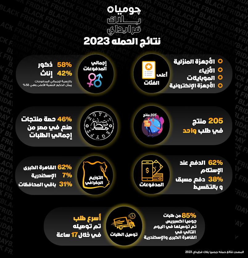 أعلنت جوميا منصة التجارية الإلكترونية في مصر عن اختتام حملة التخفيضات “البلاك فرايدي” والتي شهدت نموا ملحوظا حيث تفاعل العملاء مع ارتفاع مستويات الشراء خلال هذه الفترة وكشفت الحملة عن تفوق الذكور بنسبة 58% من اجمالي المبيعات التي تحققت خلال موسم التخفيضات خلال الفترة من 3-30 نوفمبر 2023 بينما تصدرت الإناث عدد الطلبات بنسبة 55%.