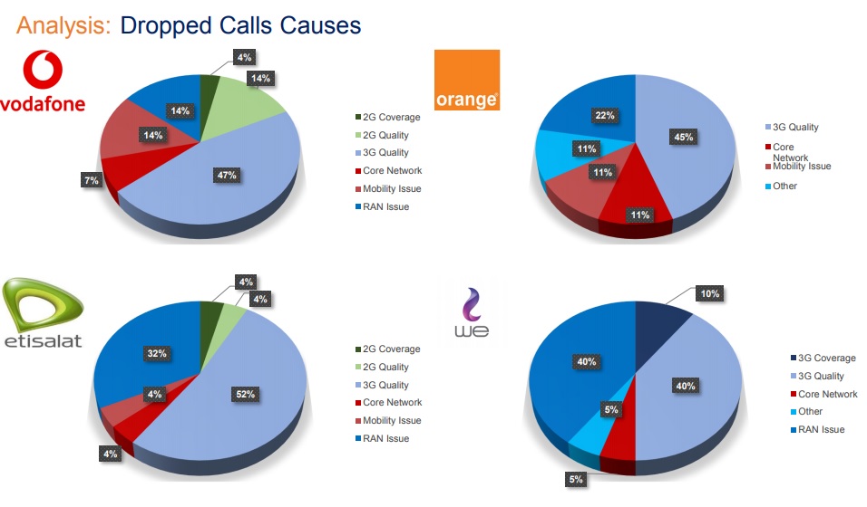 صدق الجهاز القومي لتنظيم الاتصالات هذه المرة واصدر أول تقرير لجودة خدمات المحمول والانترنت في مصر والذي كشف حقيقة جودة خدمات المحمول المقدمة من المشغلين الأربعة : اورنج ، فودافون، اتصالات، المصرية للاتصالات ، وجاء التقرير في عدد من الصفحات بلغت 215 صفحة باللغة الانجليزية ليفند الحقائق التي رصدها الجهاز بالتعاون مع شركة المانية عالمية وجاء في التقرير : أن الشركة المصرية للاتصالات كانت الأكثر نسبة في نسبة عدم إتمام المكالمات بنسبة 6.2% في محافظة القاهرة تلتها شركة اتصالات مصر بنسبة 3.66% وجاءت اورنج في المركز الثالث بنسبة 1.4% بينما جاءت فودافون في المركز الرابع بنسبة 1.2%.