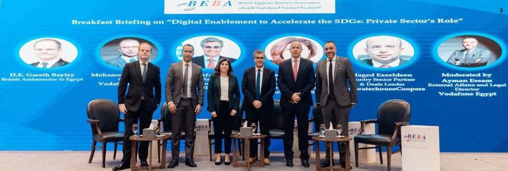 نظمت الجمعية المصرية البريطانية للأعمال (BEBA)، حفل إفطار شهدت فعالياته عقد جلسة نقاشية حول دور القطاع الخاص في التمكين الرقمي، والإسراع بوتيرة تحقيق أهداف الأمم المتحدة للتنمية المستدامة، وذلك بمشاركة مميزة لكل من السفير جاريث بايلي، السفير البريطاني في القاهرة، ومحمد عبد الله، الرئيس التنفيذي والعضو المنتدب لشركة ڤودافون مصر، وروحي أفغاني، نائب الممثل الإقليمي المقيم برنامج الأمم المتحدة الإنمائي، والسفيرة ندى العجيزي، مدير إدارة التنمية المستدامة والتعاون الدولي بجامعة الدول العربية، وماجد عز الدين، الشريك المسؤول ورئيس قسم الصفقات بمصر بشركة PWC الشرق الأوسط، وأدار الجلسة أيمن عصام، رئيس قطاع العلاقات الخارجية والشؤون القانونية بشركة ڤودافون مصر.