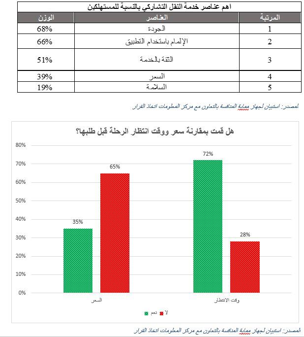واظهر الاستبيان انه بالنسبة لركاب اوبر: 44% منهم سينتقلون إلى منصة كريم، 9% سيتحولون لاستخدام التاكسي إذا ارتفع سعر خدمات أوبر بـ 10%.، أما بالنسبة لركاب كريم: 47% منهم سينتقلون إلى منصة اوبر، 8% سيتحولون لاستخدام التاكسي إذا ارتفع سعر خدمة كريم بـ 10%..