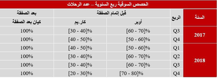 وتوضح الجداول الحصص السوقية لكل من اوبر وكريم، فوفقاً لتعريف الجهاز للسوق المعني وهو سوق نقل الركاب عن طريق التطبيقات الإلكترونية أن كيان ما بعد الصفقة سيستحوذ على 100% من السوق ولذلك ألزم الجهاز الأطراف بعدة “ضوابط والتزامات”؛ لحماية الركاب والكباتن وتشجيع الاستثمار والمنافسة داخل السوق.
