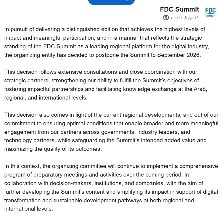 أعلنت قمة FDC، عبر صفحاتها الرسمية على منصات التواصل الاجتماعي وعلى موقع لينكدإن، عن تأجيل المؤتمر الذي كان من المقرر انعقاده في 21 أبريل، ليُقام في شهر سبتمبر 2026، وذلك في إطار سعيها لتقديم نسخة متميزة تحقق أعلى مستويات التأثير والمشاركة الهادفة.
