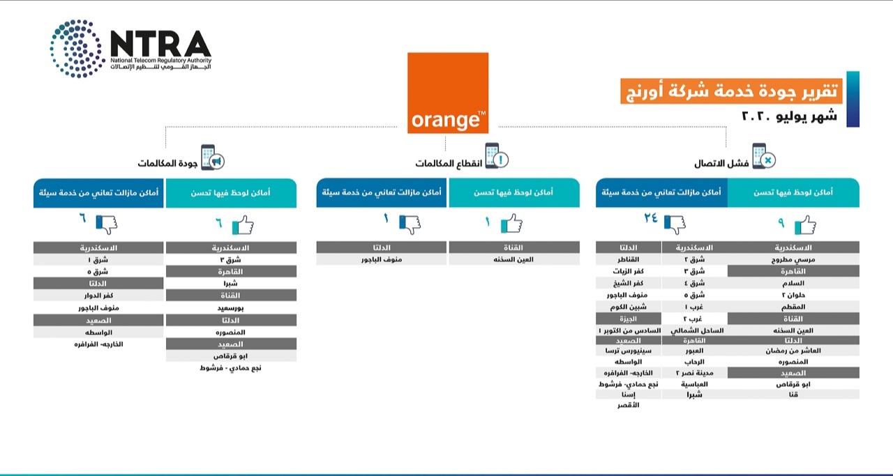 - ولشركة اورانج: من أصل (81) مدينة وحي تم اجراء اختبارات القياس عليهم تم رصد عدد (24) مدينة وحي تعانى من تأثر في مؤشر عدم بدء المكالمات، من أهمها العبور ومدينة نصر والرحاب والعباسية وشبرا في القاهرة والسادس من اكتوبر في الجيزة، وفي الإسكندرية، مناطق في شرق وغرب الاسكندرية والساحل الشمالي، ومن حيث جوده صوت المكالمات عدد (6) مدينه وحي أهمها مناطق في شرق الاسكندرية.