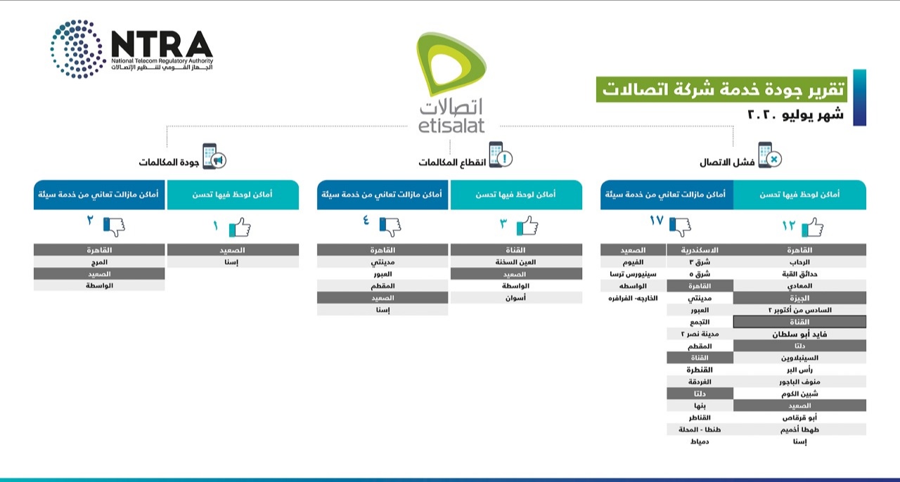 - ولشركة اتصالات: من أصل (81) مدينة وحي تم اجراء اختبارات القياس عليهم تم رصد عدد (17) مدينة وحي تعانى من تأثر في مؤشر عدم بدء المكالمات، من أهمها مدينتي والعبور ومدينة نصر والتجمع والمقطم في القاهرة ومناطق في شرق الاسكندرية، ومن حيث عدم أكتمال أو انقطاع المكالمات عدد (4) مدينه وحي وأهمها العبور والمقطم ومدينتي في القاهرة، ومن حيث جوده صوت المكالمات عدد (2) مدينه وحي أهمها المرج بالقاهرة.