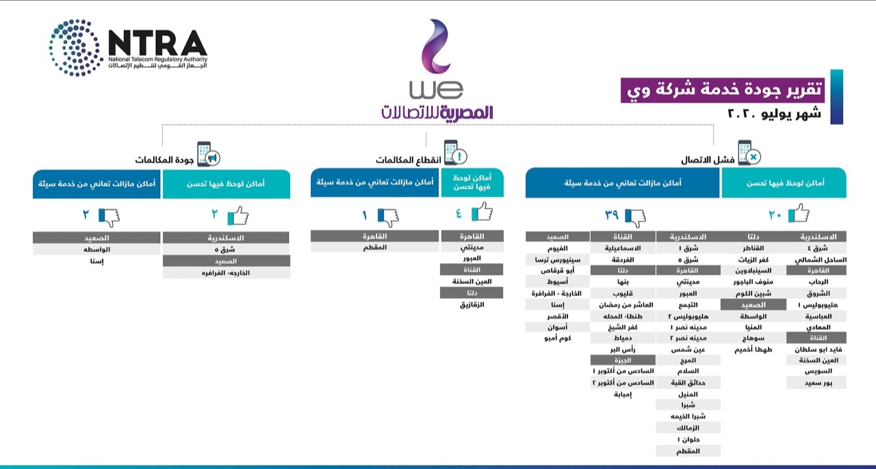 - ولشركة وي: من أصل (81) مدينة وحي تم اجراء اختبارات القياس عليهم تم رصد عدد (39) مدينة وحي تعانى من تأثر في مؤشر عدم بدء المكالمات، من أهمها مدينتي والعبور والتجمع ومصر الجديدة ومدينة نصر و عين شمس و المرج و السلام و حدائق القبة والمنيل وشبرا وشبرا الخيمة والزمالك وحلوان والمقطم في القاهرة، والسادس من اكتوبر و امبابة في الجيزة وفي الإسكندرية مناطق في شرق الإسكندرية، ومن حيث عدم أكتمال أو انقطاع المكالمات حي المقطم في القاهرة.