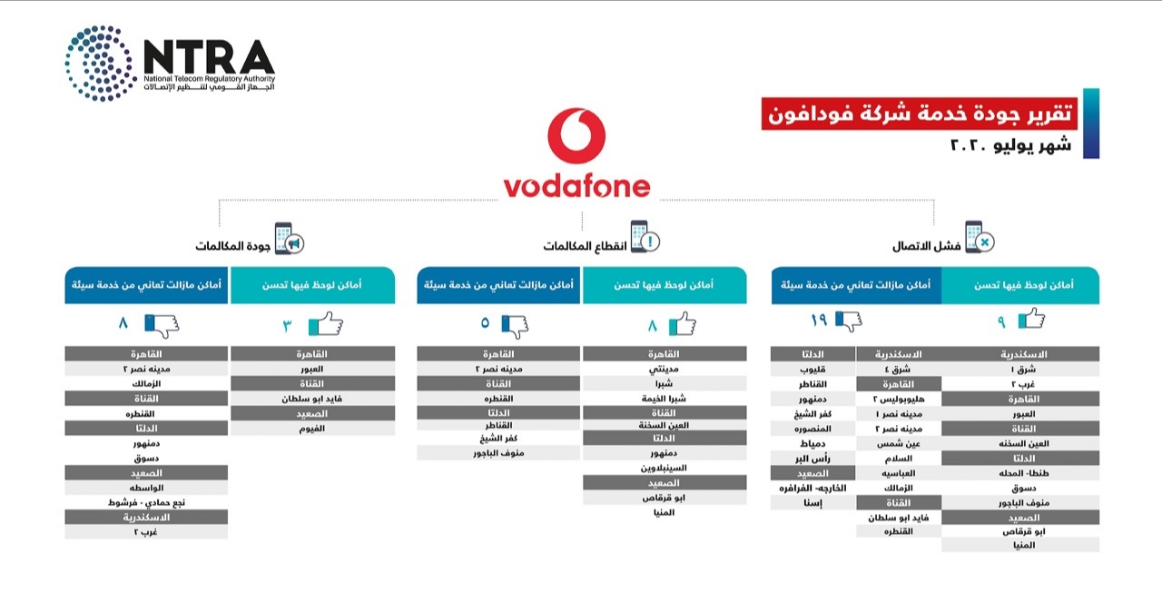 - شركة فودافون: من أصل (81) مدينة وحي تم اجراء اختبارات القياس عليهم تم رصد عدد (19) مدينة وحي تعاني من تأثر في مؤشر عدم بدء المكالمات، من أهمها مدينة نصر ومصر الجديدة وعين شمس والسلام والعباسية والزمالك في القاهرة ومناطق في شرق الاسكندرية، ومن حيث عدم أكتمال أو انقطاع المكالمات عدد (5) مدينه وحي وأهمها في القاهرة مدينة نصر، ومن حيث جوده صوت المكالمات عدد (8) مدينه وحي أهمها في القاهرة مدينة نصر والزمالك وفي الاسكندرية مناطق غرب الاسكندرية.