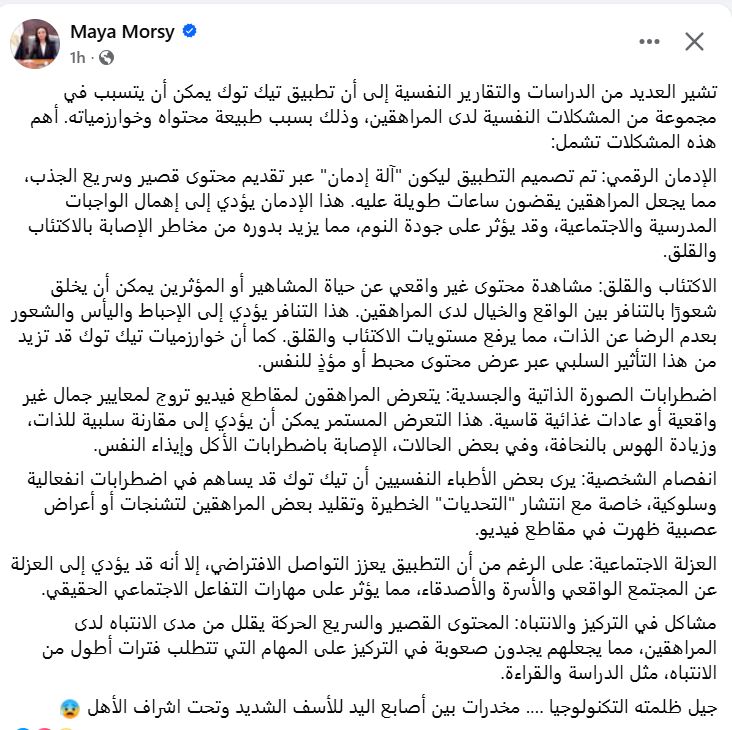 حذّرت الدكتورة مايا مرسي،وزيرة التضامن الاجتماعي، من التأثيرات النفسية الخطيرة لاستخدام تطبيق تيك توك بين المراهقين، وذلك في منشور نشرته عبر صفحتها الرسمية على فيسبوك، واصفة التطبيق بأنه “مخدر رقمي بين أصابع اليد، وللأسف تحت إشراف الأهل”.