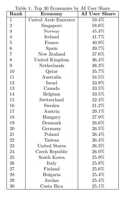 📊 الترتيب الإقليمي لاستخدام أدوات الذكاء الاصطناعي (وفق تقرير مايكروسوفت):