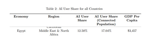 وأكد التقرير أن العلاقة بين الناتج المحلي للفرد ومستوى تبنّي الذكاء الاصطناعي تعدّ وثيقة، حيث تسجّل الدول ذات البنى التحتية القوية ومستويات التعليم العالية معدلات استخدام أعلى، مشيرًا إلى ضرورة الاستثمار في التعليم الرقمي والتدريب وبناء القدرات لتمكين المزيد من المستخدمين من الاستفادة من هذه التقنيات.