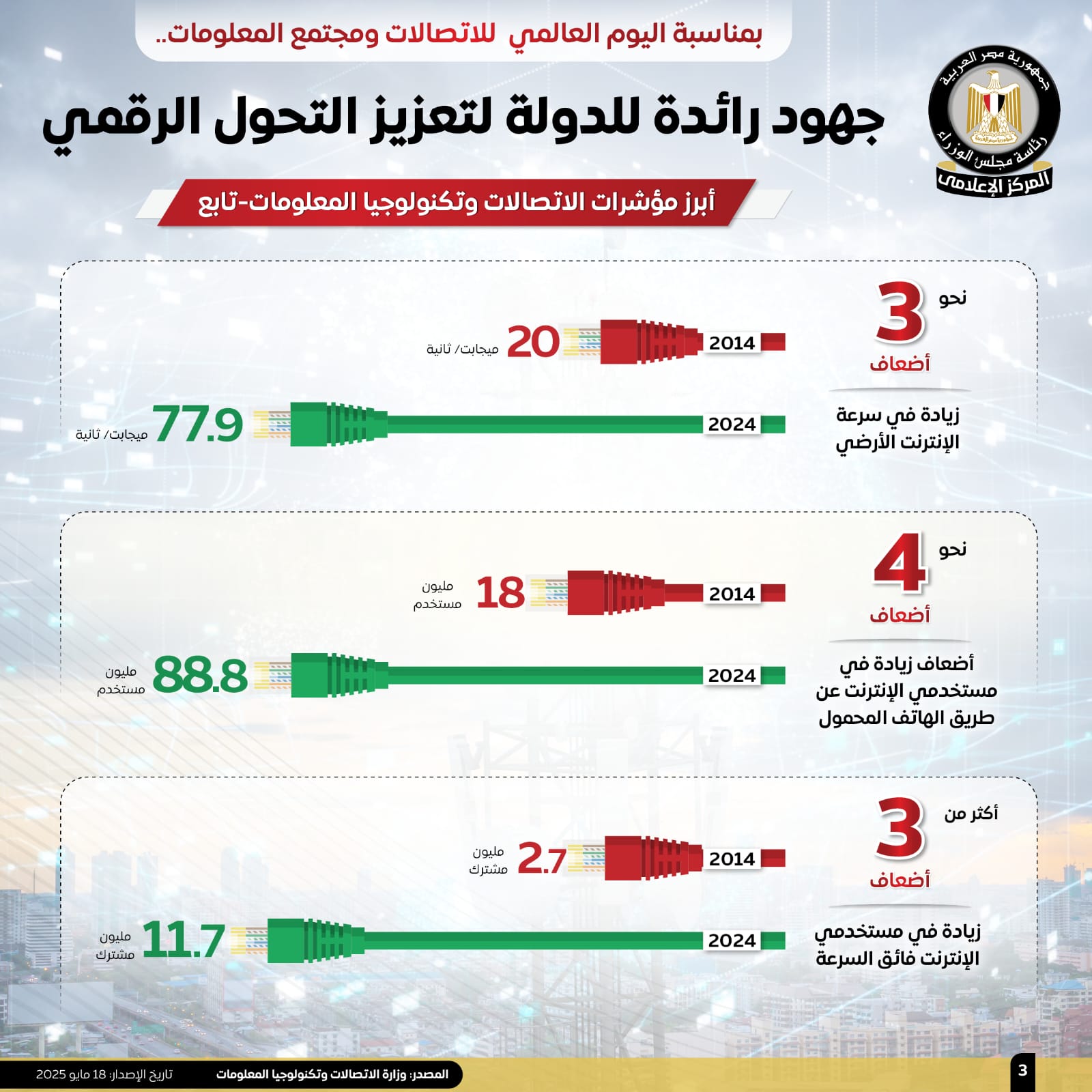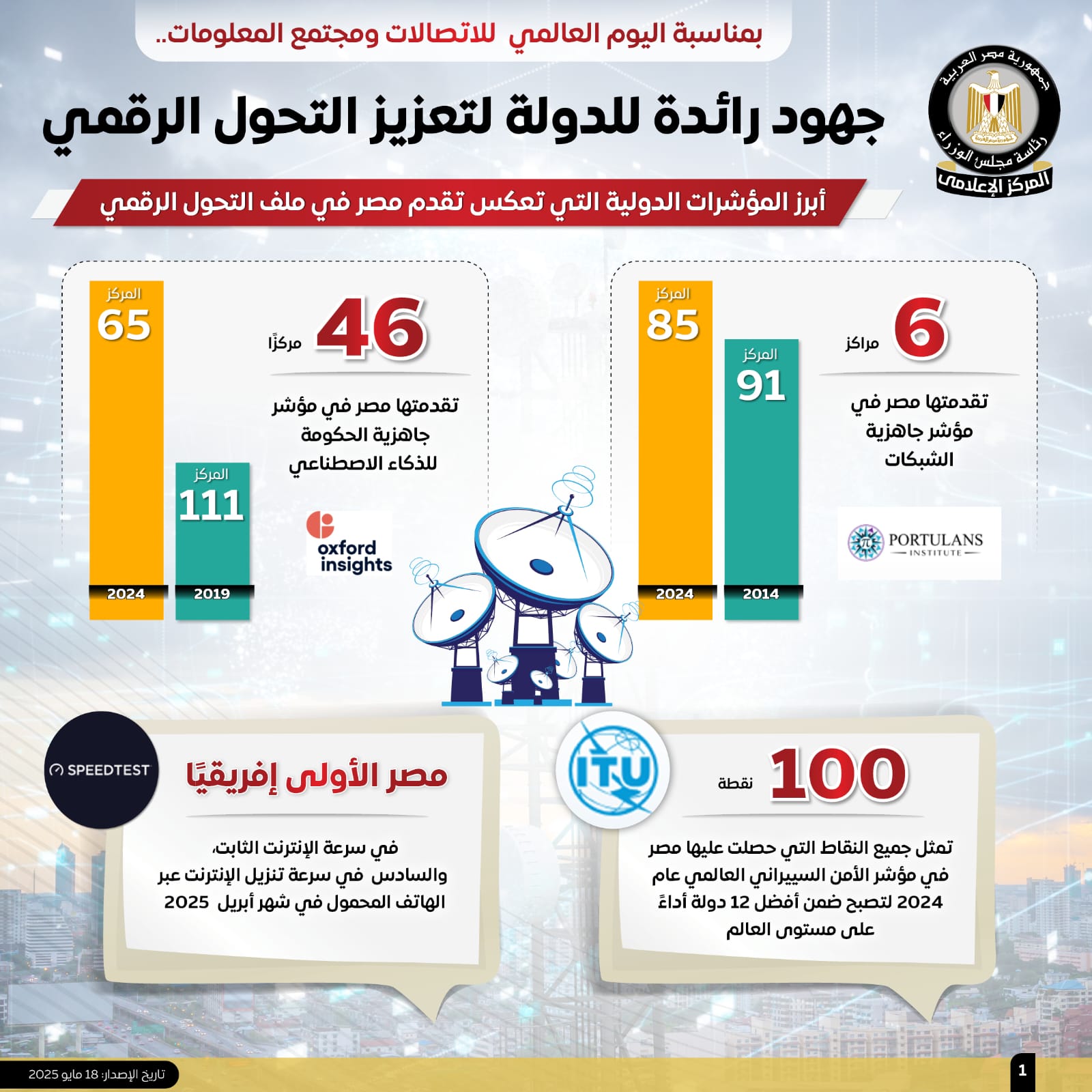 نشر المركز الإعلامي لمجلس الوزراء، مجموعة من الإنفوجرافات عبر منصاته على مواقع التواصل الاجتماعي، بمناسبة اليوم العالمي للاتصالات ومجتمع المعلومات، سلطت الضوء على الجهود الرائدة التي تبذلها الدولة لتعزيز التحول الرقمي، باعتباره محورًا رئيسًا لتحقيق التنمية المستدامة، وتبرز هذه الجهود ما تحقق في مجالات تطوير البنية التحتية التكنولوجية، وميكنة الخدمات الحكومية، وتحديث منظومة العمل الإداري، بما أسهم في تحسين جودة الخدمات المقدمة للمواطنين، ودعم الشفافية، ورفع كفاءة الأداء المؤسسي، إلى جانب تعزيز تنافسية الاقتصاد الوطني.