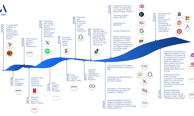 تحتفل هذا الشهر مجموعة Aleph الشركة العالمية المتخصصة في مجال الإعلانات الرقمية والخدمات المالية والتكنولوجيا التعليمية، بعيدها السنوي العشرين. تأسست الشركة في الولايات المتحدة الأمريكية في ميامي عام 2005وتطورت لتصبح أحدى أهم الشركات العالمية التي تقود التحول الرقمي في أكثر من 150سوقًا حول العالم من خلال شراكات استراتيجية مع أكثر من ٦٠ شريكًا حصريًا مثل إكس أمازون وسبوتيفاي وجوجل وكريتيو وميتا ومايكروسوفت وبينتريست وريديت وسنابوتيك توك وتويتش وأوبر وغيرها.