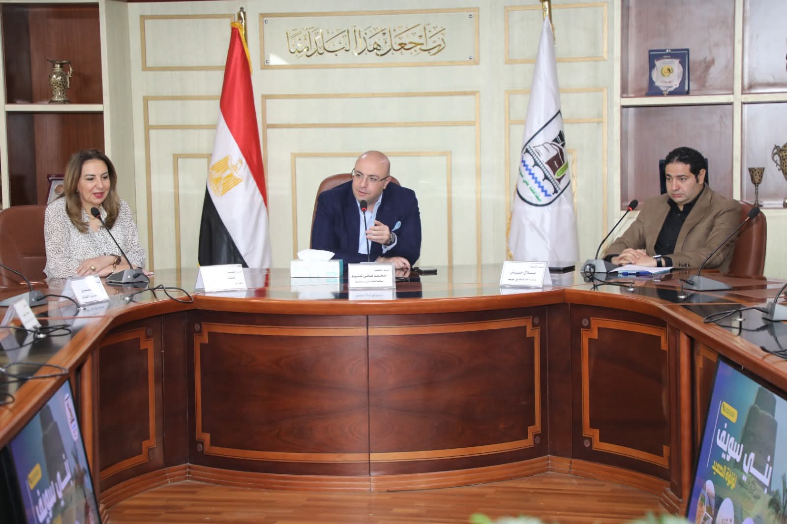 حضر الاجتماع:”بلال حبش”نائب محافظ بني سويف، المهندسة غادة لبيب نائب وزير الاتصالات وتكنولوجيا المعلومات للتطوير المؤسسي وعدد من قيادات ومسؤولى الوزارة ضم:الدكتور مؤمن العشماوي، مستشار نائب الوزير للتطوير المؤسسي،المهندس هيثم فاروق مدير وحدات نظم المعلومات والتحول الرقمي، المهندس ديفيد مدحت مسؤول تطوير التطبيقات، بجانب:الدكتور عمرو الضبع عميد الأكاديمية العربية للعلوم الإدارية ،والأستاذ أحمد دسوقي مديرمكتب المحافظ ، وممثلو الشركات المُنفذة للتدريب _ من خلال وزارة الاتصالات وتكنولوجيا المعلومات_