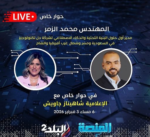 تستضيف الإعلامية شاهيناز جاويش على شاشة فضائية صدى البلد غدًا الثلاثاء ، محمد الزمر،مدير أول حلول البنية التحتية والذكاء الاصطناعي بشركة دل تكنولوجيز مصر والسعودية وبلاد الشام وومنطقة شمال غرب إفريقيا  في لقاء خاص يتناول موضوعات الابتكار والتكنولوجيا الحديثة وتأثيرها على المستقبل.