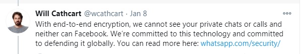 أكد مدير شركة واتساب ويل كاثكارت، أن المحادثات بين الاطراف مشفرة من طرف للاخر ، مشيرا أنه لا يمكننا رؤية محادثاتك أو مكالماتك الخاصة ولا يمكن لـ Facebook أيضًا. نحن ملتزمون بهذه التكنولوجيا ونلتزم بالدفاع عنها عالميًا.