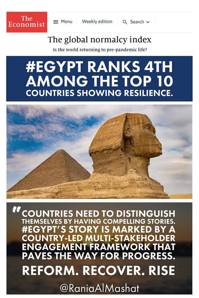 قالت الدكتورة رانيا المشاط، وزيرة التعاون الدولي، إن جمهورية مصر العربية احتلت المرتبة الرابعة بين أكبر 50 اقتصاد على مستوى العالم، في «مؤشر عودة الحياة الطبيعية» الجديد، الذي أطلقته مجلة الإيكونوميست الدولية، ليرصد من خلال عدد من العوامل والمؤشرات عودة الحياة الطبيعية في بلدان العالم، بعد الآثار السلبية التي خلفتها جائحة كورونا ودفعت الدول لفرض قيود شديدة على التنقل خلال العام الماضي.