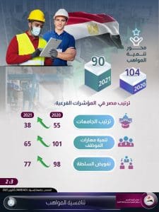 قام مركز المعلومات ودعم اتخاذ القرار بمجلس الوزراء، برصد ومتابعة ترتيب مصر في “المؤشر العالمي لتنافسية المواهب” الصادر عن جامعة “إنسياد” في أكتوبر 2021، حيث تقدمت مصر 13 مركزاً في هذا المؤشر لتصبح في المركز 84 في عام 2021، وذلك مقارنة بالمركز 97 في عام 2020، كما حققت تقدمًا ملحوظًا أيضاً في مؤشراته الفرعية.