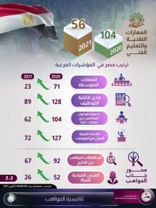 ووفقاً للمؤشر فقد قفزت مصر 48 مركزًا في مؤشر التعليم الفني والمهارات التقنية لتحتل المرتبة 56 عام 2021، مقارنة بالمرتبة 104 عام 2020، كما تقدمت مصر في المؤشرات الفرعية ذات الصلة لتصبح في المركز 23 عام 2021 مقارنة بالمركز 71 عام 2020 في مؤشر المهارات المتوسطة، وكذلك تقدمت مصر في مؤشر مدى قابلية التوظيف لتحتل المرتبة 89 عام 2021 مقارنة بالمرتبة 128 عام 2020، كما احتلت مصر المرتبة 62 في 2021 مقارنة بالمرتبة 104 في 2020 وفقاً لمؤشر سهولة الوصول لموظفين ذوي مهارات عالية، بجانب احتلالها المرتبة 72 في 2021 مقارنة بالمرتبة 127 في 2020 وذلك في مؤشر ملاءمة طبيعة العمل مع المؤهلات.