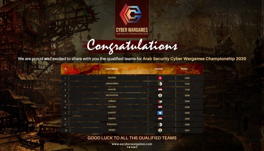 حيث فاز بالمركز الاول فريق the3000 من دولة تونس ،وفاز بالمركز الثاني cybererudites من دولة الجزائر ،وفاز بالمركز الثالث revers3c من دولة مصر، وفاز بالمركز الرابع sqrtnwarlock من دولة الهند ،وفاز بالمركز الخامس nullbyte من دولة الاردن، وفاز بالمركز السادس s3nat0rs من دولة مصر، وفاز بالمركز السابع xxs6907 من القارة القطبية الجنوبية، وفاز بالمركز الثامن b3y0nd من دولة مصر ،وفاز بالمركز التاسع th3jackers من دولة الجزائر، و فاز بالمركز العاشر bi0sbl من دولة الهند.