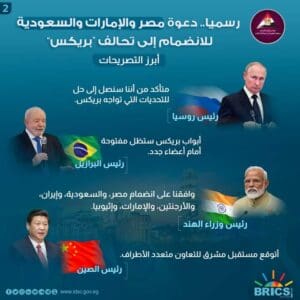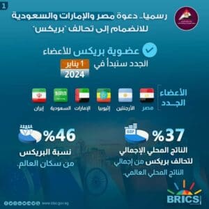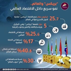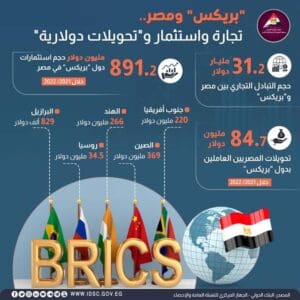 لاشك ان الغد بيد الله ولا أحد يعلمه غيره ، إلا أن النظرة التفاؤلية من جانب الاقتصاديين بالمزايا التي ستتمتع بها مصر بعد قبول انضمامها رسميا مع 5 دول اخرى لمجموعة البىيكس تعطي نظرة تفاؤلية للمستقبل .وعقب إعلان تجمع “بريكس” عن دعوة مصر للانضمام لعضويته اعتباراً من يناير 2024، أصدر مركز المعلومات ودعم اتخاذ القرار بمجلس الوزراء، تحليلاً جديداً سلَّط من خلاله الضوء على “قمة تجمع البريكس الأخيرة التي تعقد بجنوب إفريقيا في أغسطس 2023” حيث شهدت القمة مشاركة لمسئولي عدد كبير من الدول، بما في ذلك مصر، حيث يحضر الدكتور مصطفى مدبولي، رئيس مجلس الوزراء، نيابة عن الرئيس عبدالفتاح السيسي، رئيس الجمهورية.