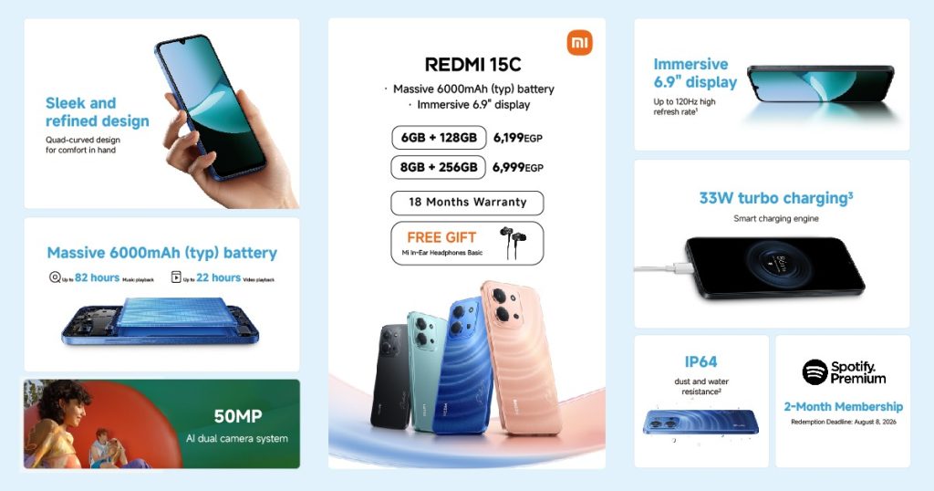 ويتوفر هاتف Redmi 15C في السوق المصرية بأسعار تنافسية تبدأ من 6199 جنيهًا لنسخة 6 جيجابايت رام + 128 جيجابايت سعة تخزين، بينما تأتي النسخة الأعلى بمواصفات 8 جيجابايت رام + 256 جيجابايت سعة تخزين بسعر 6999 جنيهًا، مع ضمان رسمي لمدة 18 شهرًا.