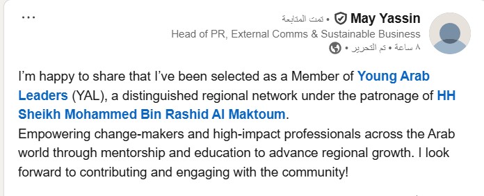 عبر حسابها الشخصي على منصة لينكد إن أعربت مي ياسين رئيس قسم الاتصالات الخارجية وأعمال الاستدامة بشركة فودافون مصر، عن سعادتها بانضمامها رسميًا إلى شبكة القادة العرب الشباب (Young Arab Leaders – YAL)، وهي شبكة إقليمية مرموقة تعمل تحت رعاية صاحب السمو الشيخ محمد بن راشد آل مكتوم، نائب رئيس دولة الإمارات العربية المتحدة رئيس مجلس الوزراء حاكم دبي.