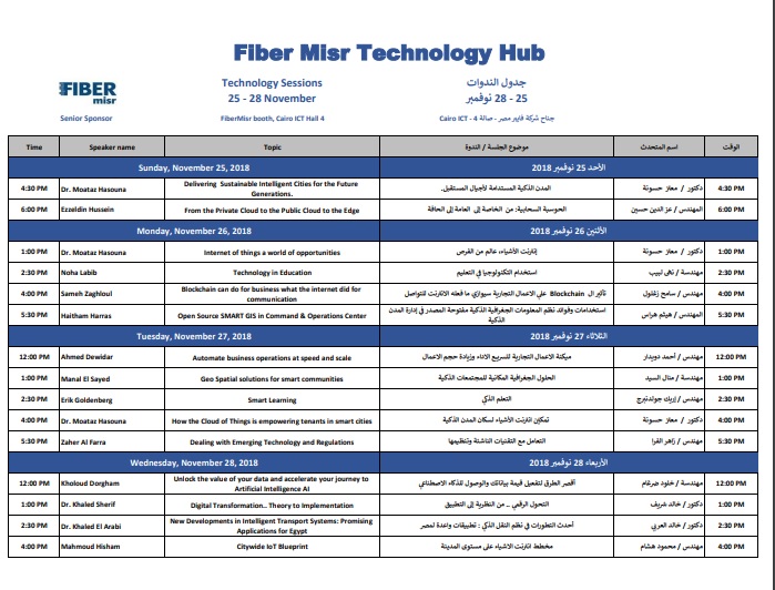 خلال مشاركتها للمرة الاولى في معرض القاهرة الدولي للتكنولوجيا cairo ICT 2018 تعقد شركة فايبر مصر عدد من الندوات التثقيفية والتعريفية ببعض المفاهيم الحديثة والتي يحاضر فيها عدد من الخبراء المصريين والدوليين .