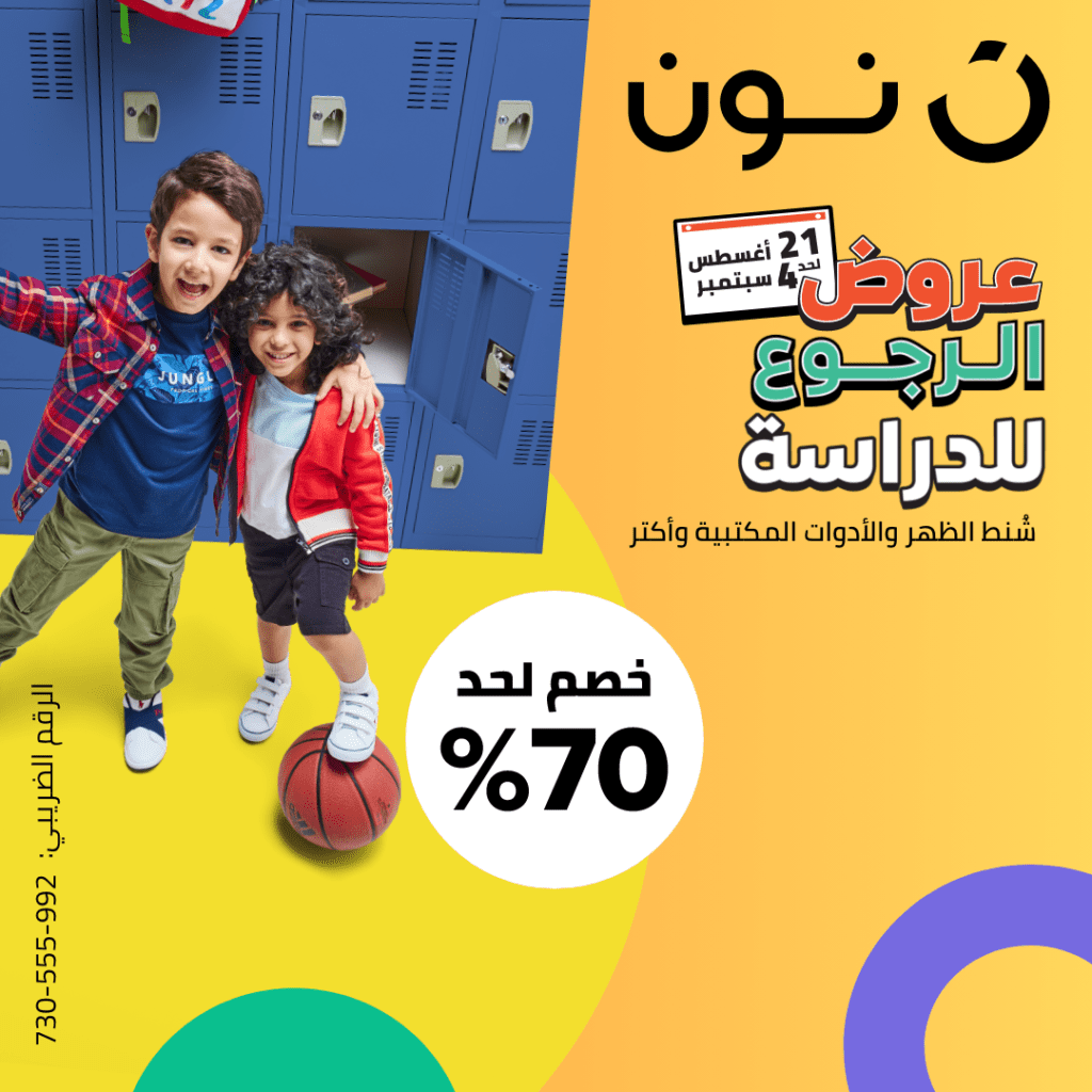 أطلقت نون، المنصة الرقمية المتخصصة في التسوق الإلكتروني في الشرق الأوسط عروض موسم العودة إلى المدارس، والتي بدأت في 21 أغسطس وستمتد حتى 4 سبتمبر، يمكن للمتسوقين الاستمتاع بعروض مذهلة من خلال تخفيضات تصل إلى 70% على مجموعة واسعة من المنتجات من مختلف الفئات.