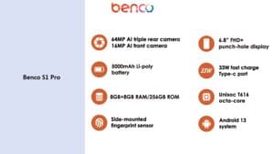 مجهزة ببطارية قوية بسعة 5000 مللي أمبير في الساعة من نوع Li-poly وقدرات شحن سريع من نوع 33 واط من نوع C، تضمن بنكو إس 1 برو للمستخدمين في مصر البقاء متصلين ومنتجين طوال اليوم، مما يقلل من الوقت المقضى موصولين بالحائط ويزيد من الوقت في الحركة.