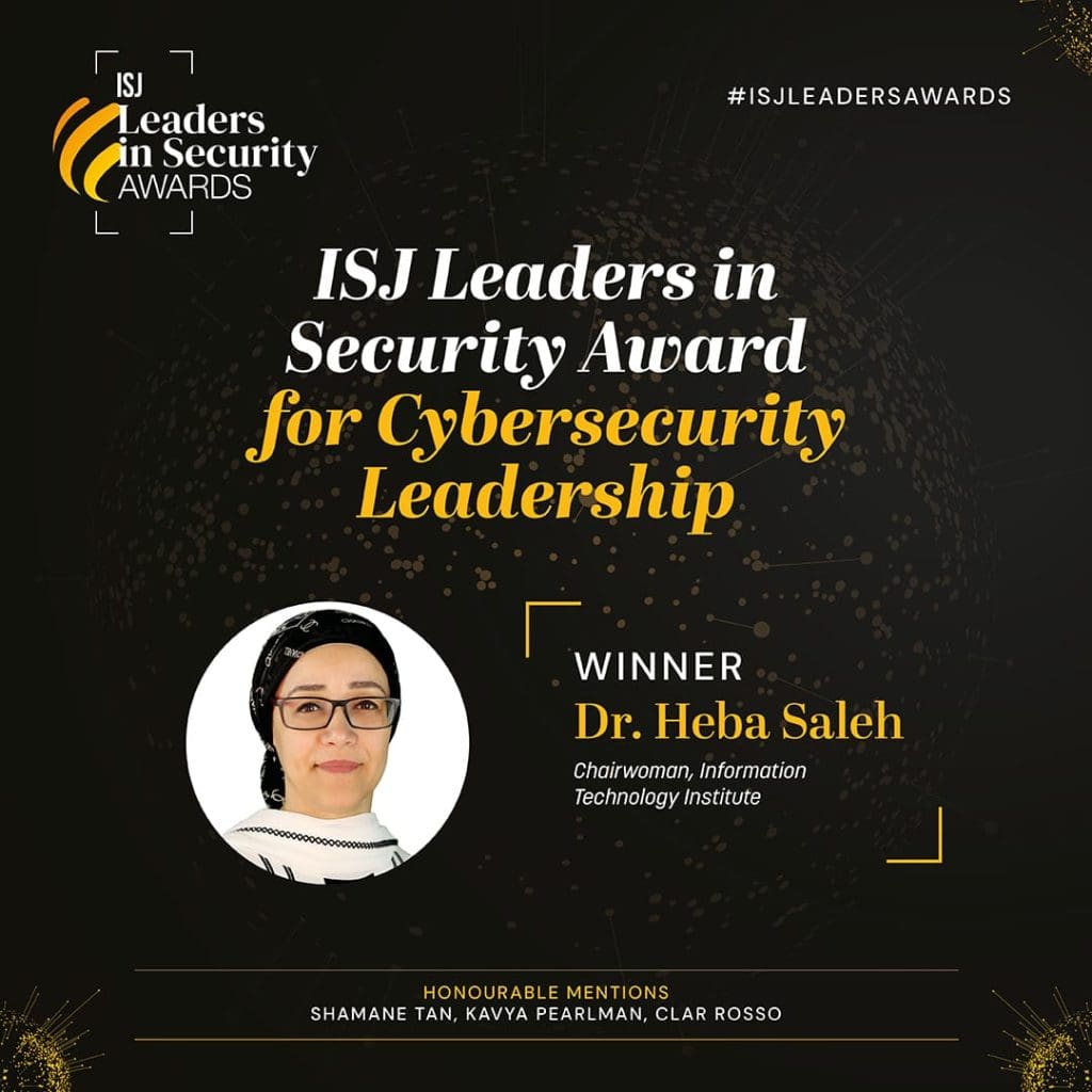 أعلنت الجمعية الدولية للأمن السيبراني ISJ عن فوز الدكتور هبة صالح رئيس معهد تكنولوجيا المعلومات ITI بجائزة قادة الأمن من الجمعية لعام 2024 وذلك لجهودها في مجال الأمن السيبراني.