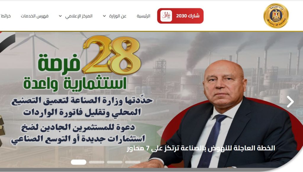 في إطارتوجيهات الفريق مهندس كامل الوزير نائب رئيس مجلس الوزراء للتنمية الصناعية وزير الصناعة والنقل بتعريف مجتمع الصناعة بخدمات وأنشطة وزارة الصناعة وجهاتها التابعة، أطلقت الوزارة موقعاً إلكترونياً جديداً خاص بها لتعزيز التواصل مع المستثمرين والجمهور على الرابط التالي: https://www.mind.gov.eg/#/home.