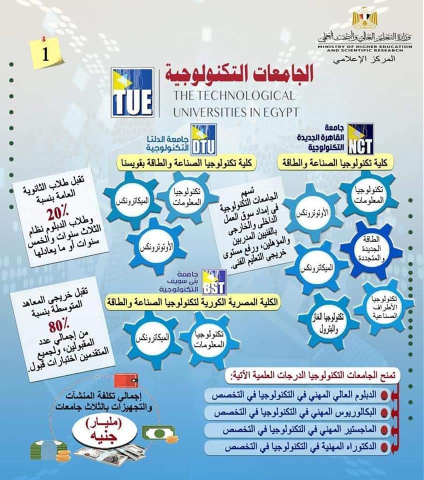 وأشار التقرير إلى إنشاء ثلاث جامعات تكنولوجية حتى الآن، والتى بدأت الدراسة بها في العام الدراسى 2019/2020، وبلغت تكلفة المنشآت والتجهيزات بها حوالي مليار جنيه، وهي: