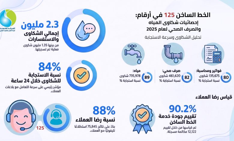 وسجلت شكاوى مياه الشرب نحو 735,978 شكوى، بنسبة استجابة بلغت 82%، في إطار الالتزام بزمن الاستجابة المستهدف، كما بلغ عدد شكاوى الصرف الصحي نحو 461,620 شكوى، بنسبة استجابة مرتفعة وصلت إلى 89%، في حين تم التعامل مع 135,675 شكوى متعلقة بالمحاسبة والفواتير بنسبة استجابة 80%.
