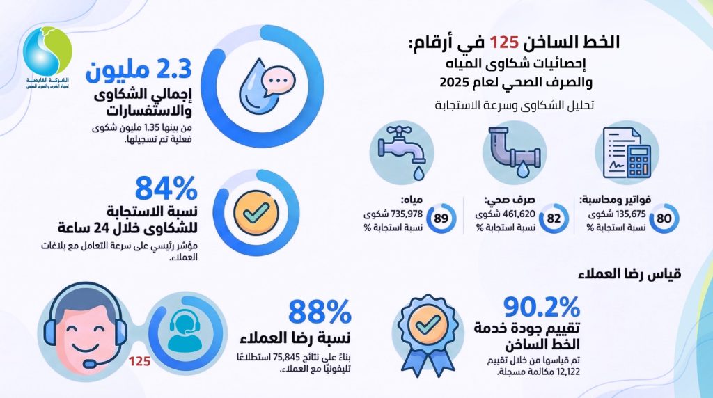 وسجلت شكاوى مياه الشرب نحو 735,978 شكوى، بنسبة استجابة بلغت 82%، في إطار الالتزام بزمن الاستجابة المستهدف، كما بلغ عدد شكاوى الصرف الصحي نحو 461,620 شكوى، بنسبة استجابة مرتفعة وصلت إلى 89%، في حين تم التعامل مع 135,675 شكوى متعلقة بالمحاسبة والفواتير بنسبة استجابة 80%.