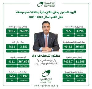 كشفت الهيئة القومية للبريد المصرية عن تحقيق نتائج أعمال بمعدلات مرتفعة خلال العام المالي 2020-2021 حيث بلغ اجمالي إيرادات الخدمات نحو 3.394 مليار جنيه بمعدل نمو 5 % ، وبلغ إجمالي إيرادات الاستثمار 26.9696 مليار جنيه بمعدل نمو 0.2 % ،وبلغ صافي أرباح العام 3.183 مليار جنيه بمعدل نمو 51 %.وجاء إجمالي المصروفات العمومية و الإدارية بمعدل متناقص حيث بلغت 26.487 مليار جنيه بمعدل انخفاض -3.5 %.