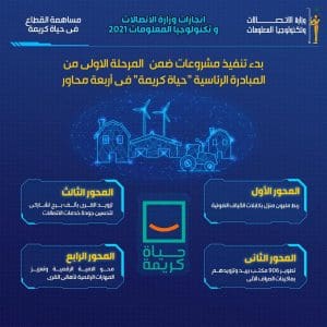 بدأت وزارة الاتصالات وتكنولوجيا المعلومات فى تنفيذ عدد من المشروعات فى إطار مشاركتها فى المرحلة الأولى من المشروع القومى لتطوير القرى المصرية “حياة كريمة” وذلك بهدف رفع كفاءة البنية التحتية المعلوماتية للقرى ونشر الثقافة الرقمية لخلق مجتمع رقمى تفاعلى بما يعزز الجهود المبذولة لبناء مصر الرقمية وتمكين المواطنين من الاستخدام الفعال لتكنولوجيا المعلومات والاتصالات؛ وذلك من خلال العمل حاليا وفقا لأربعة محاور وهى ربط القرى بكابلات الألياف الضوئية لرفع كفاءة خدمات الإنترنت لمليون منزل بكلفة تصل إلى نحو 5.8 مليار جنيه، والعمل على تطوير عدد 906 منفذ بريدى وتطوير عدد 11 منفذ توزيع وتزويد المكاتب بماكينات الصارف الآلى، بالإضافة إلى تحسين جودة خدمات الاتصالات من خلال تزويد القرى بمحطات شبكات المحمول بعدد الف برج تشاركى، فضلا عن محو الامية الرقمية وبناء القدرات فى مجال التكنولوجيا، والتمكين الاقتصادى الرقمى لأهالى القرى.