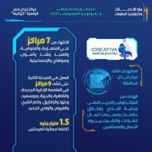 كما تم التشغيل التجريبى لعدد 2 مركز ابداع مصر الرقمية والتشغيل الفعلى لعدد ٥ ليصل الإجمالى إلى 7 مراكز، فيما جارى العمل على انشاء 9 أخرون بتكلفة اجمالية للمرحلتين 1.5 مليار جنيه وذلك فى إطار خطة تستهدف انشاء مركز فى كل محافظة بهدف إتاحة التدريب التقنى ورعاية الابداع بما تشمله من معسكرات العصف الذهنى، وحاضنات ومسرعات أعمال للشركات، مع تدريب للقائمين على هذه الشركات، وإقامة محافل للتشبيك بينهم والمستثمرين.