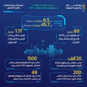 ارتفعت مؤشرات قطاع الاتصالات وتكنولوجيا المعلومات ليحافظ على مكانته كأعلى قطاعات الدولة نموا. وكان أبرز مؤشرات القطاع فى 2021 :-