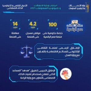 أصدرت صباح اليوم وزارة الاتصالات وتكنولوجيا المعلومات بيان صحفي يضم إنجازات العام كله بواقع 5600 كلمة تقريبا ، وترصدICTBusiness هذه الانجازات في التقرير التالي:حققت وزارة الاتصالات وتكنولوجيا المعلومات خلال عام 2021 خطوات وثابة فى تنفيذ استراتيجية مصر الرقمية والتى تهدف من خلالها إلى تبنى أحدث التكنولوجيا العالمية، ودعم الفكر الابتكارى لخلق مجتمع رقمى متكامل يتم من خلاله بناء الانسان المصرى، وتطوير قطاعات الدولة، وتعزيز مكانة مصر على خريطة صناعة الاتصالات وتكنولوجيا المعلومات.