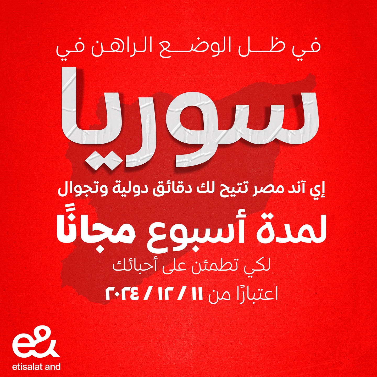 كما أعلنت شركة إي آند مصر عن نفس العرض لإتاحة المكالمات والرسائل النصية لمدة أسبوع مجانًا ورفع شعار ” لكي تطمئن على أحبائك”.