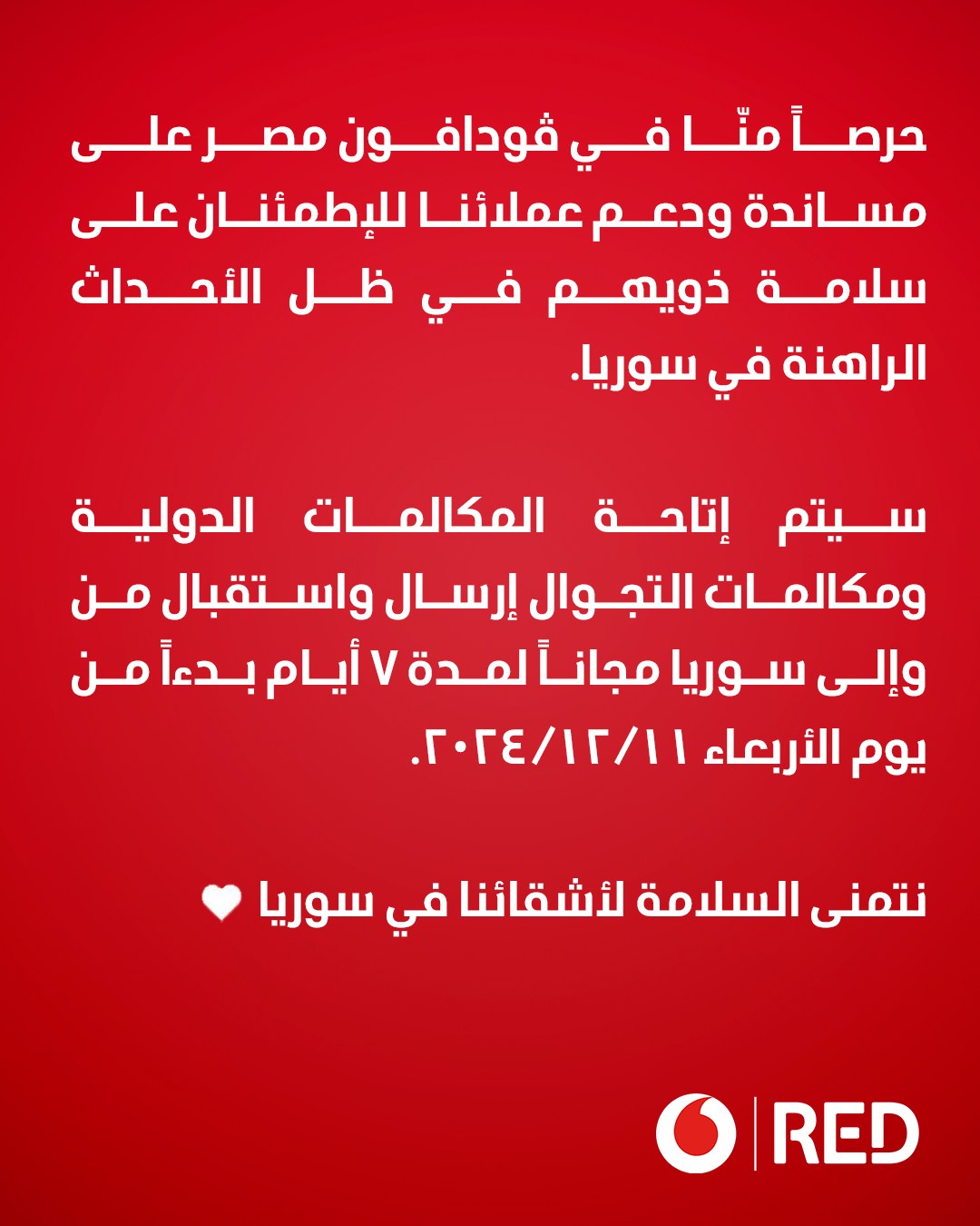 ويأتي ذلك حرصا من فودافون مصر على سلامة ومساندة ودعم العملاء للإطمئنان على أهلهم وذويهم في الأراضي السورية.