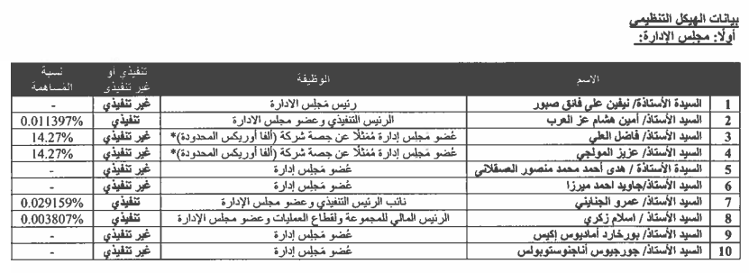 كما يضم كذلك كلا من إسلام زكري (عضو مجلس إدارة – تنفيذي)، و بورخارد أماديوس إكيس (عضو مجلس إدارة – غير تنفيذي). وجورجيوس أناجنوستوبولس (عضو مجلس إدارة – غير تنفيذي).