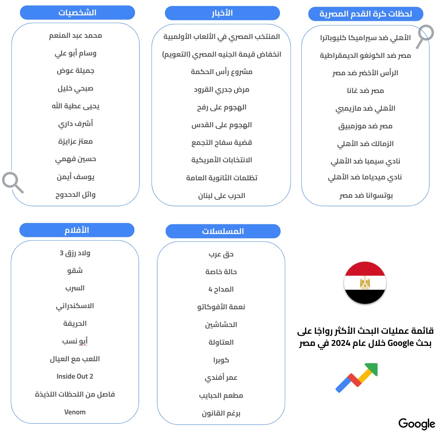 *مصر:* في فئة الأخبار، احتلّت مشاركة منتخب مصر لكرة القدم في الأولمبياد المرتبة الأولى، تليها مواضيع محلية وإقليمية وعالمية متنوعة، بما يشمل الحرب في فلسطين والانتخابات الأمريكية. كما تصدّر لاعب كرة القدم المصري “محمد عبد المنعم” قائمة الشخصيات الأكثر بحثًا، يليه “وسام أبو علي”، ما يؤكد مكانة كرة القدم في قلوب المصريين. ولم تغِب السينما عن القائمة، فحظي فيلم “ولاد رزق 3” بشعبية كبيرة، ما يؤكد استمرار نجاح هذه السلسلة من الأفلام.