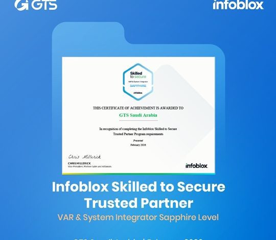 أعلنت شركة GTS السعودية عن تحقيق إنجاز جديد يعزز مكانتها في سوق الأمن السيبراني، وذلك بحصولها رسميًا على اعتماد Infoblox Skilled to Secure – Trusted Partner، عقب اجتيازها بنجاح جميع متطلبات برنامج الشراكة.