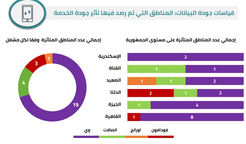 2- أظهر استطلاع رأي المستخدمين رضا العميل عن جودة خدمة الإنترنت: حصلت شركة وي على نسبة 74% بمؤشر جودة خدمة الانترنت تليها شركتي فودافون واتصالات بنسبة 71% وشركة أورانج بنسبة 69% بينما جاء تقرير جودة الخدمة للربع الرابع كما يلي :أن هناك عدد المناطق (المدن والأحياء) التي تم رصد أنها تعاني من مشاكل في جودة خدمات تنزيل البيانات فودافون: تم رصد عدد 3 مناطق تعاني مشاكل من جودة خدمات تنزيل البيانات، وعلى رأسها القاهرة والدلتا ، أورانج: تم رصد منطقة واحدة تعاني مشاكل من جودة خدمات تنزيل البيانات، وهي منطقة الصعيد ،اتصالات: تم رصد عدد 4 مناطق تعاني مشاكل من جودة خدمات تنزيل البيانات، وعلى رأسها الجيزة والدلتا والقناة ، وي: تم رصد عدد 19 منطقة تعاني مشاكل من جودة خدمات تنزيل البيانات، وعلى رأسها القاهرة والجيزة والدلتا والإسكندرية.