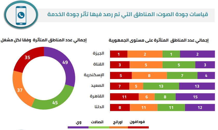 1- أظهر استطلاع رأي المستخدمين أن هناك حالة من الرضا عن جودة خدمة الصوت حيث حصلت شركة اتصالات على نسبة 78% بمؤشر جودة خدمة الصوت تليها شركة أورانج بنسبة 76% وشركة فودافون بنسبة 75% وشركة وي بنسبة 74% ، بينما رصد التقرير الربع سنوي عن جودة الخدمة وأكد ان هناك سوء في الخدمات الصوتية للشركات الاربعة فودافون: تعاني من سوء جودة الخدمات الصوتية في 35 منطقة، وعلى رأسها القاهرة والدلتا والصعيد والإسكندرية ، أورانج: تعاني من سوء جودة الخدمات الصوتية في 37 منطقة ، وعلى رأسها الدلتا والإسكندرية والقاهرة والقناة ،اتصالات: تعاني من سوء جودة الخدمات الصوتية في 45 منطقة، وعلى رأسها الصعيد والدلتا والقاهرة والاسكندرية ،وي: تعاني من سوء جودة الخدمات الصوتية في 49 منطقة ، وعلى رأسها القاهرة والصعيد والدلتا والإسكندرية.