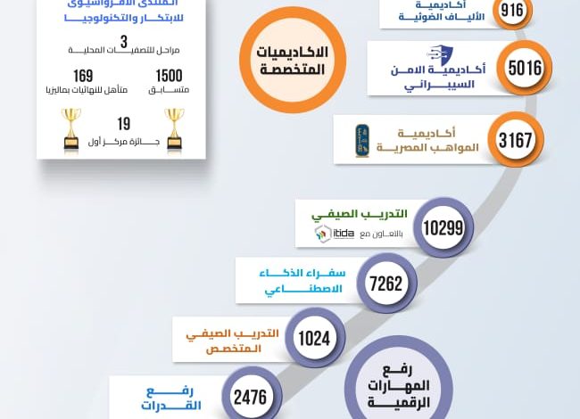 كما شهد برنامج التدريب الصيفي لعام 2025 تخريج أكثر من 10299 متدربًا من طلبة الجامعات والمعاهد، بالتعاون مع هيئة تنمية صناعة تكنولوجيا المعلومات (إيتيدا)، عبر أكثر من 27 مسارًا تدريبيًا حديثًا، وبمشاركة متدربين من جميع محافظات الجمهورية، إلى جانب تنفيذ برامج تدريب صيفي متخصصة بالتعاون مع الجامعات الخاصة والأهلية، استفاد منها 1024 طالبًا. وفي الإطار نفسه، أسهمت مبادرة رفع القدرات في تخريج 2476 متدربًا جديدًا، دعمًا لمواءمة المهارات مع المتطلبات المتسارعة لسوق العمل.