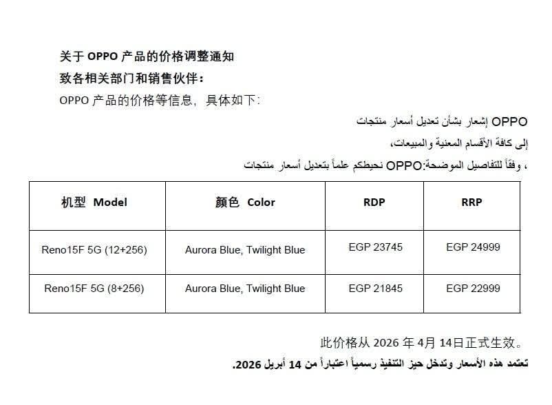 أعلنت شركة OPPO عن تعديل أسعار عدد من هواتفها الذكية في السوق المصري، وفق إخطار رسمي موجّه إلى شركاء التوزيع، على أن يبدأ تطبيق الأسعار الجديدة اعتبارًا من 14 أبريل 2026.